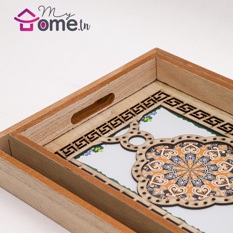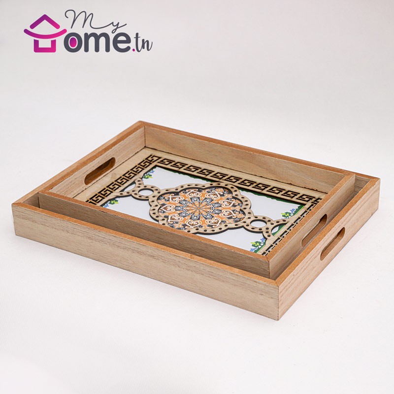 Ce coffret est composé de deux plateaux en bois naturel , ayant une belle finition et design chic, avec une plaque de Plexiglass qui met en valeur le beau motif des plateaux, Les plateaux sont idéals pour présenter les desserts , fruits, boissons ,,,